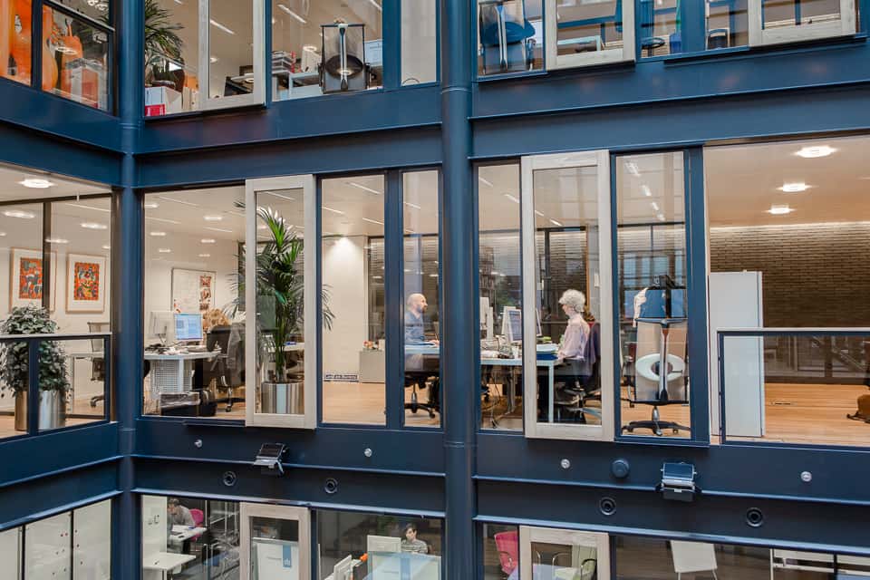 Achter de 2 monumenten aan het Buitenhof staat een kantoor met veel licht en ruimte. De verbouwing heeft ervoor gezorgd dat oud- en nieuwbouw een inzichtelijk en transparant geheel werden. Er zijn 200 werkplekken waarvan er veel flexibel zijn. De architect heeft vrije ruimten gemaakt waar je kunt vergaderen, waar je zitjes kunt maken, waar de mediatheek is, waar je ook gewoon je werk kunt doen.