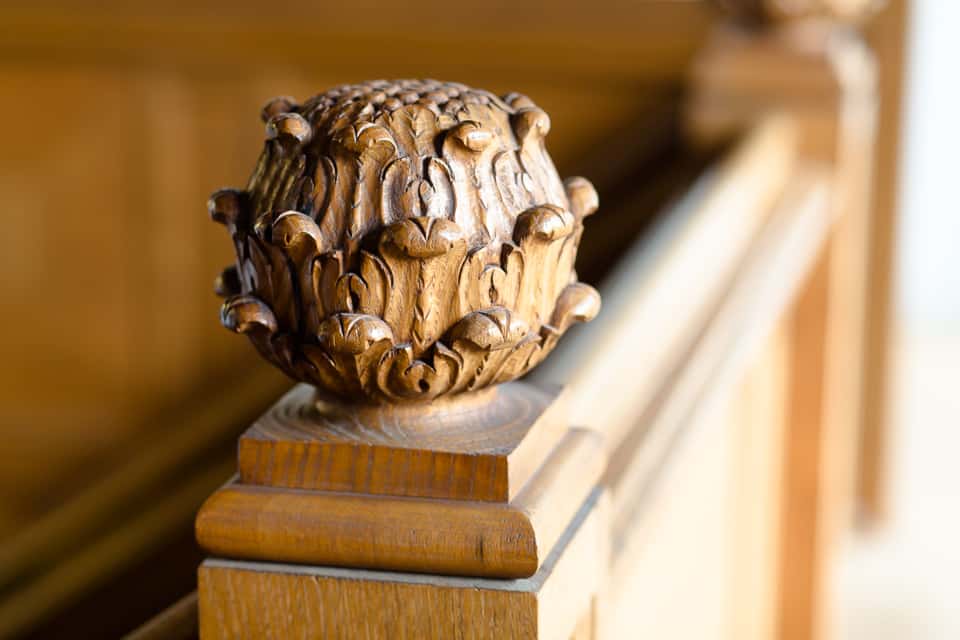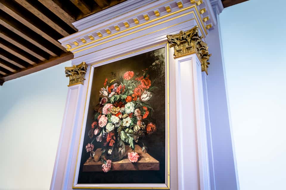 Waar tegenwoordig het secretariaat van DPC zit, zijn een bijzondere schouw en pilasters te bewonderen. Ze lijken van marmer, maar zijn van hout. Delen van de vierkanten platte zuilen zijn oud. Van de pilasters van de schouw zijn alleen de uitgesneden bloemranken later toegevoegd. De 3 nepzuilen met kroonlijst rechts van de haard stonden waarschijnlijk ooit in een vestibule of hal. Van die ornamenten zijn alleen de voetstukken, kapitelen en neuslijst begin jaren ’70 van de vorige eeuw bijgemaakt. Boven de haard hangt een oud schilderij waarop kinderen staan afgebeeld. In het kamertje achter de schouw stamt bijna het gehele houten plafond uit de 17e eeuw, al hing het elders.